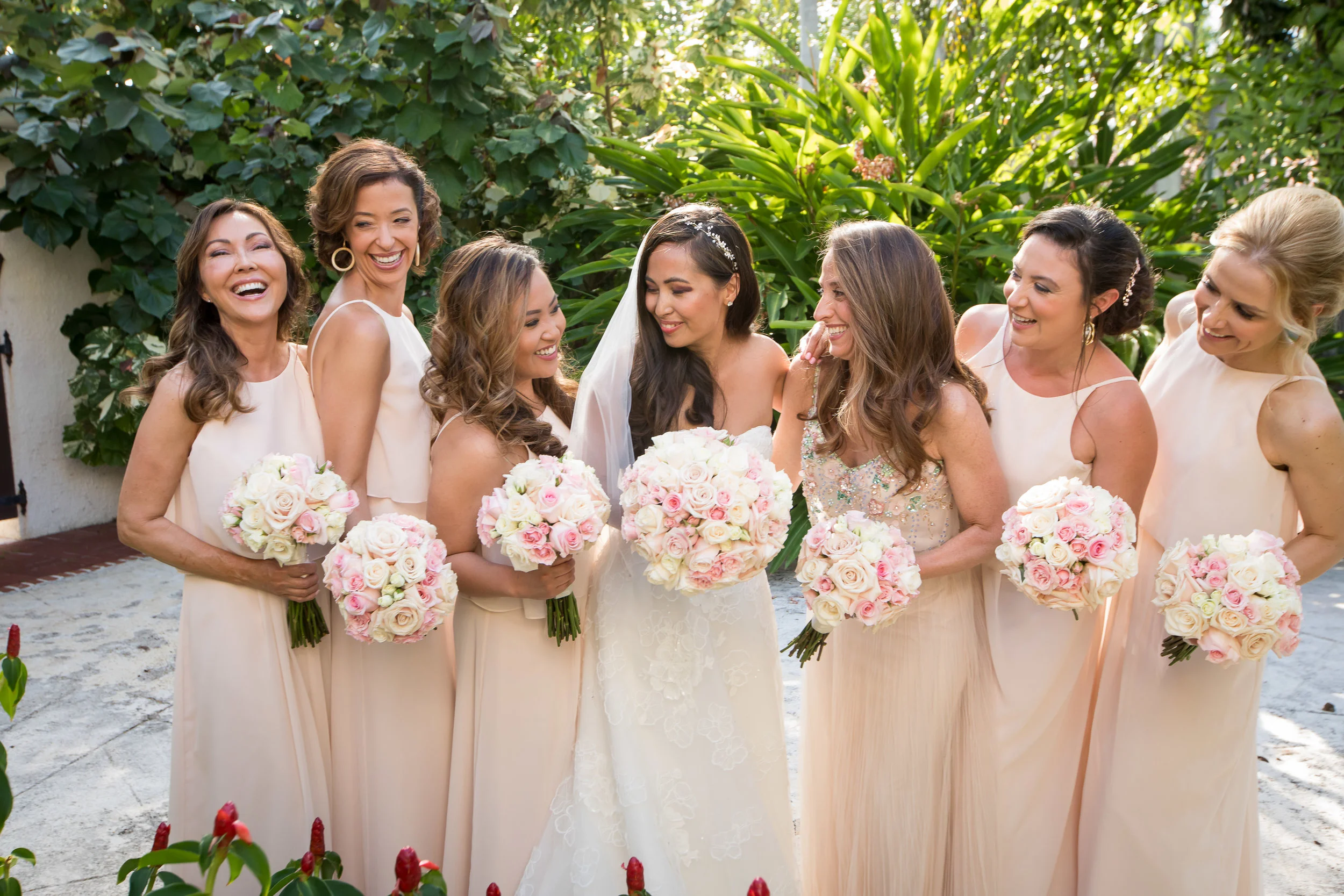 Group of women and young girls dressed in formal attire at a celebration or wedding reception, standing together and smiling.