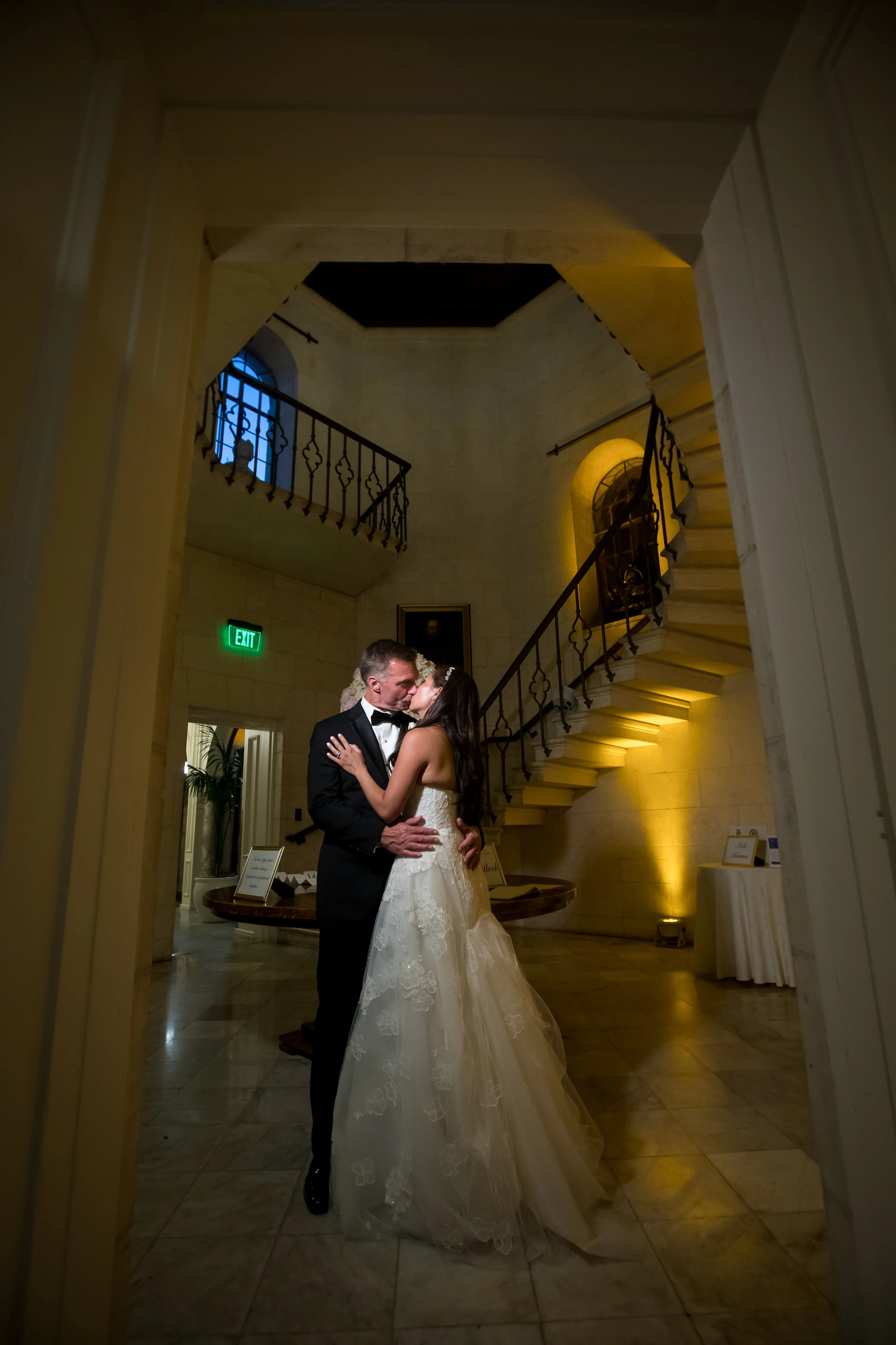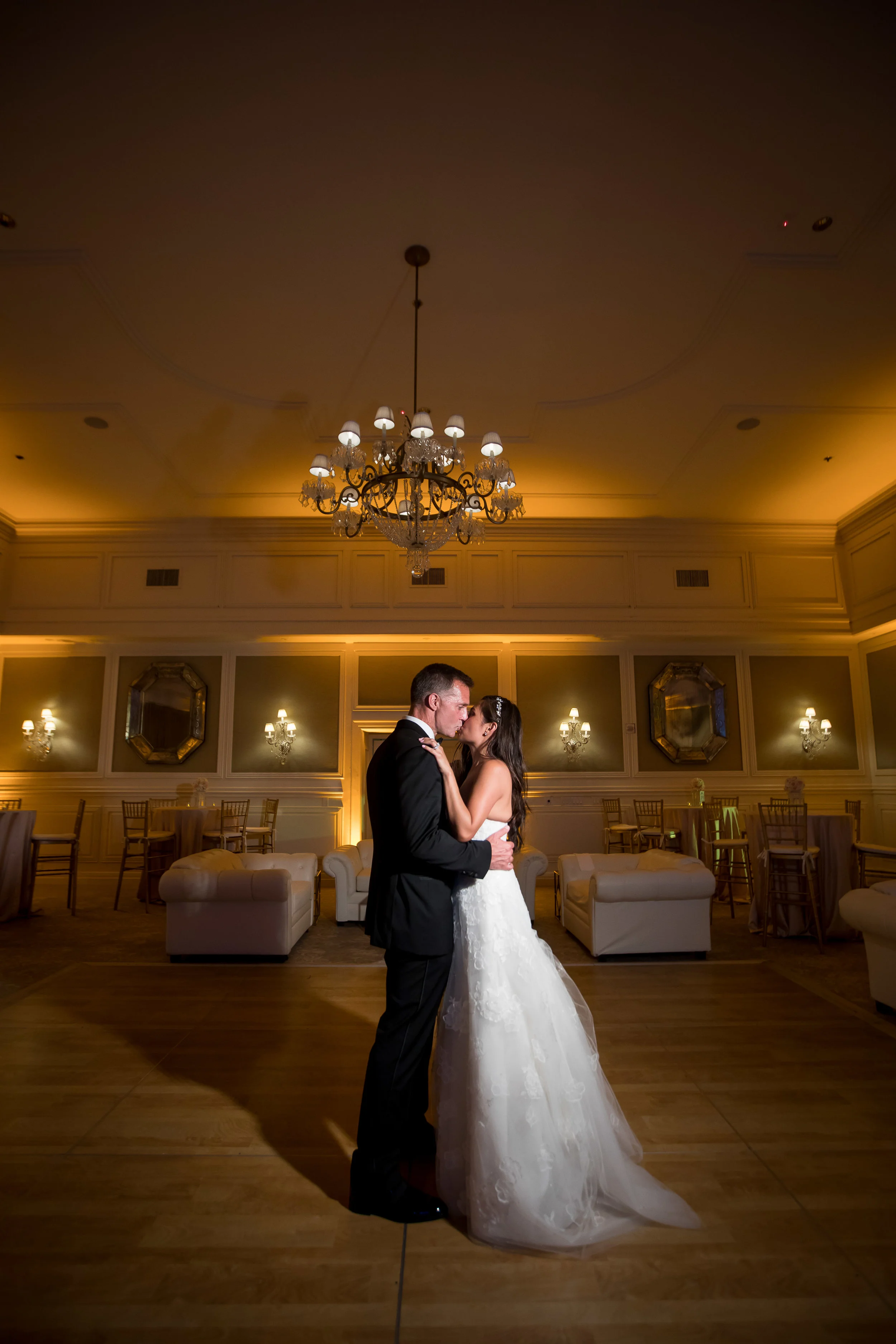 A man in a tuxedo and a woman in a formal dress posing together at a wedding reception, with other guests and a chandelier in the background.